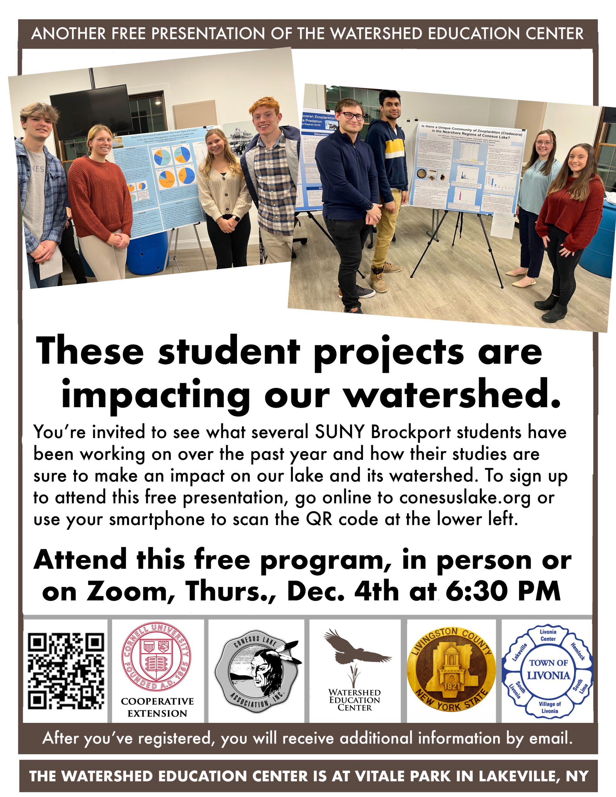 You are invited to see another educational video from the Conesus Lake Association's Watershed Education Center. Tonight's video comes from the work of the students of Dr. Isidro " Sid" Bosch from SUNY Geneso and Dr. Michael Chislock from SUNY Brockport. Their students will present 11 posters and give talks on their envirnomental studies and limnology courses.